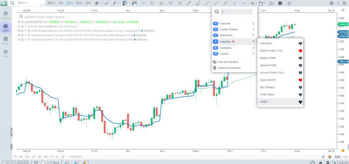 The VWAP indicator is located on the Indicators Dropdown Menu under Orderflow category. When you click on it, the indicator will get added with default settings.