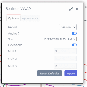 Standard Deviation Bands. When the parameter is active, the standard deviation lines up and down from VWAP will be additionally calculated on the chart. Specify the number of standard deviations in the “Value” field