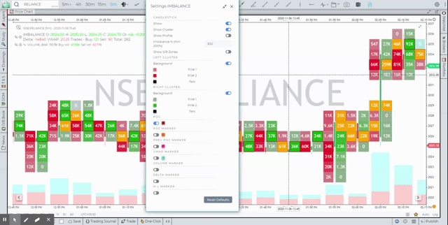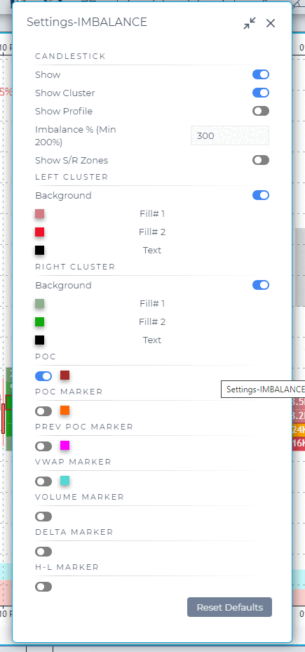Click on the gear icon on the Chart Legend/Tooltip to open the Settings Dialgue for Imbalance Charts